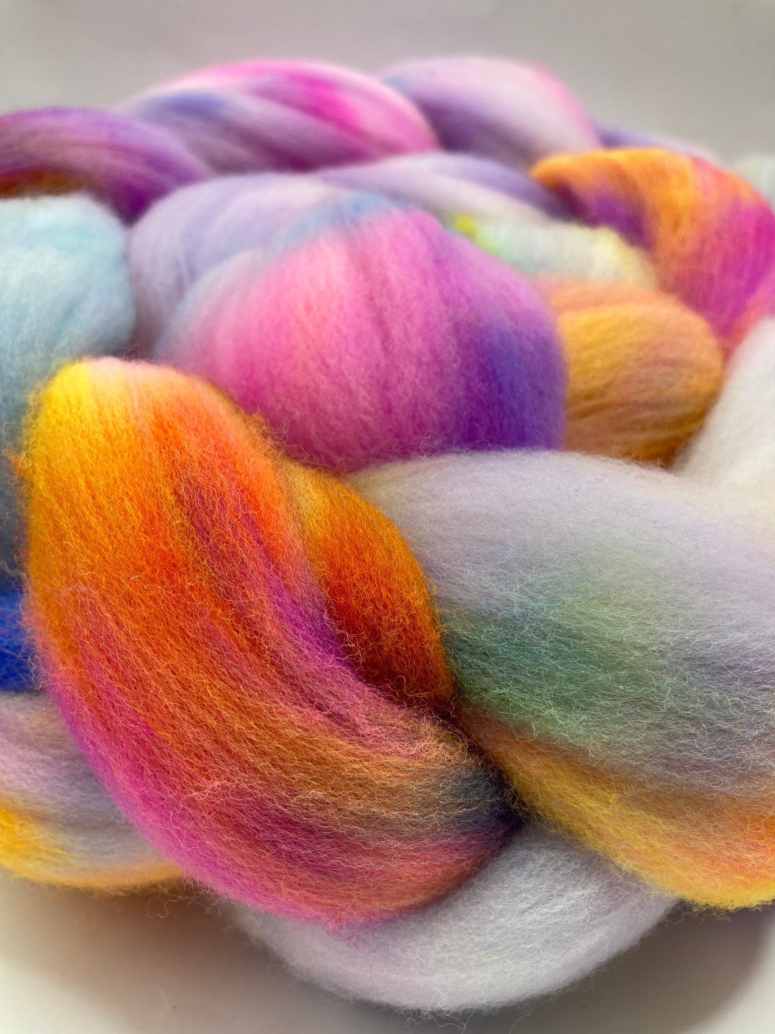 Our 100% Rambouillet wool is sourced in the United States, and has a staple length of approximately 3 inches, with a 21.5 micron count. This is one of our most popular bases for its luscious bounciness and its ‘smooth like butter’ finished spin.