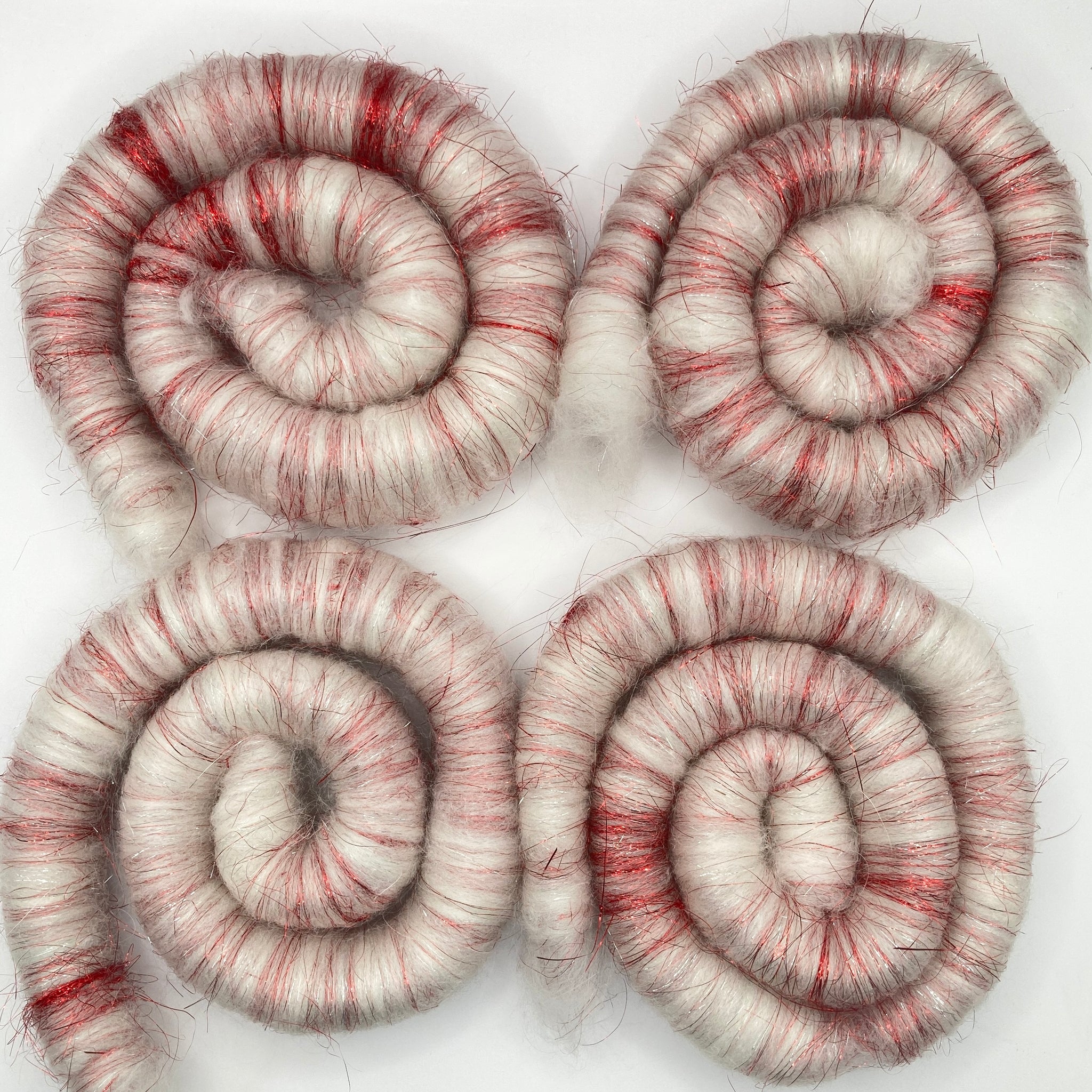 Rolags are bits of fiber that have been blended together on a blending board and then rolled off with a dowel. They are wonderful for drop spinning or wheel spinning, and great for beginners and experts alike. What fun art yarn will you create? This set of rolags weighs approximately 1.4 oz and is made from superwash shaniko, stellina, angora rabbit fiber, and merino wool.