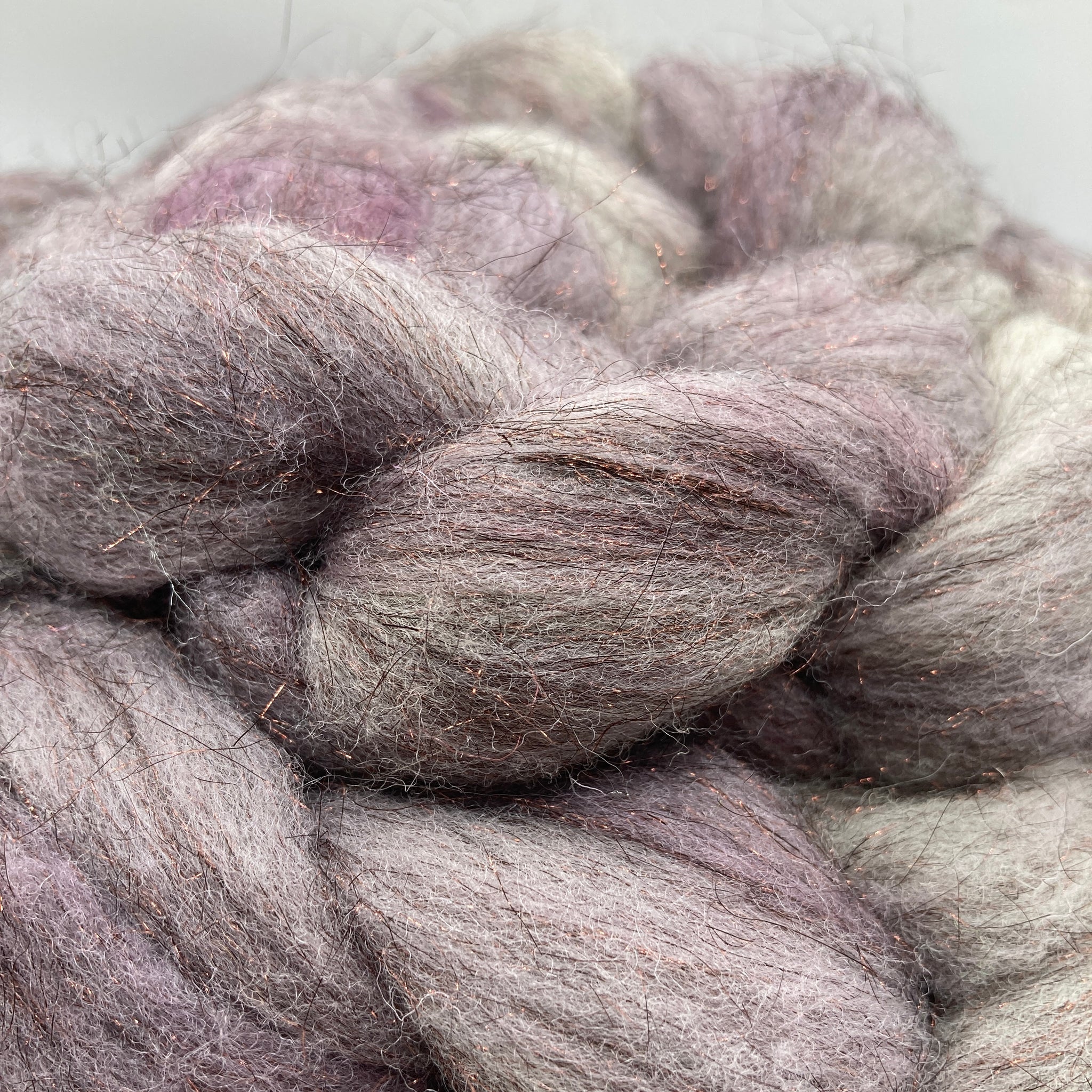 Bronze Sparkle roving is for the lovers of natural tones and sparkle alike! Each 4oz braid is comprised of 70/30 Merino/Bronze Stellina. The merino is naturally white, but takes on a copper hue due to the 30% Stellina content, and colors overdyed are appropriately muted. Dyed by KnitzAndPearls Fiberworks in Madison Wisconsin.
