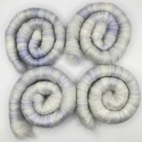 2) 100% Blue-Faced Leicester - BFL is a British luster longwool, 25-27 microns, staple length 4 ¼ inches. The fiber feels finer than the micron count would suggest. This is one of our airiest, loftiest rovings.