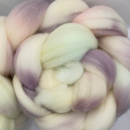 Check out our lovely collection of rovings! Each braid is hand dyed in house. All of our wool rovings are sold in approximately 4oz braids unless noted otherwise. At KnitzAndPearls Fiberworks, we take pride in how each braid produced here is lofty, airy, and easy to draft. We currently carry the following wool bases: